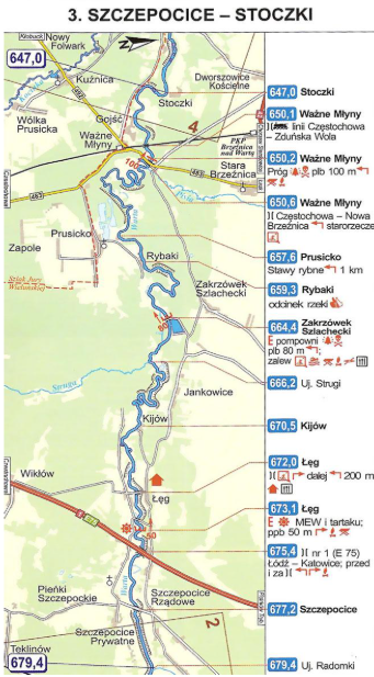 Spływ kajakowy na tym odcinku Warty zaczynamy przy moście drogowym na południe od centrum wsi Łęg w pobliżu mostu drogowego, gdzie łagodny brzeg stwarza dogodne warunki na wodowanie kajaków. Trasa prowadzi nas wśród lasów łęgowych (zalewowych).